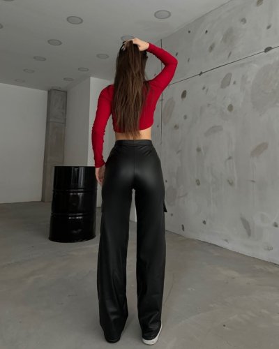 • Kadın yüksek bel önden fermuarlı yandan cep detaylı deri kargo pantolon